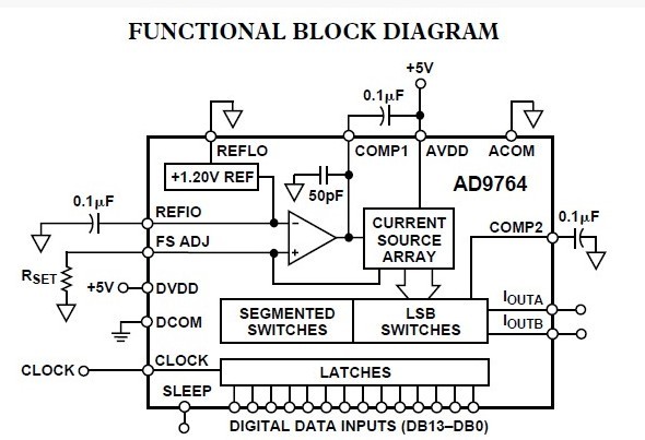 The AD9764AR is a 14-bit, 125 MSPS TxDAC D/A converter. The AD9764AR is the 14-bit resolution member of the TxDAC series of high performance, low power CMOS digital-to-analog converters (DACs). The AD9764AR which consists of pin compatible 8-, 10-, 12-, and 14-bit DACs, is specifically optimized for the transmit signal path of communication systems. The AD9764ARUZ shares the same interface options, small outline package and pinout, providing an upward or downward component selection path based on performance, resolution and cost.