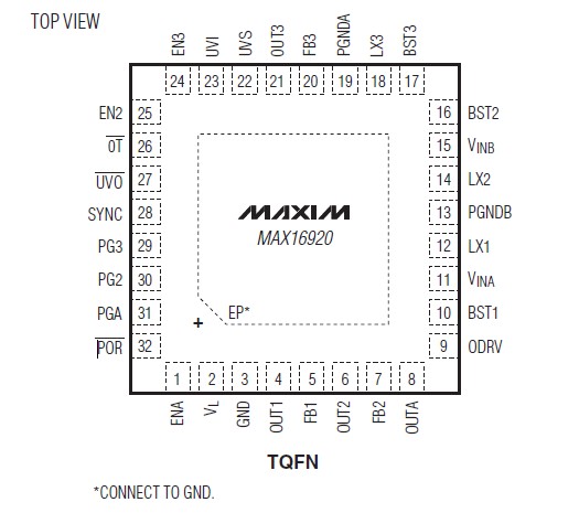 MAX16920BATJ/V+ absolute maximum ratings: (1)OUT1, OUT2, FB1, FB2, FB3, POR, PG2, PG3, PGA, OT to GND: -0.3V to +6V; (2)UVO, EN2, EN3, ENA, OUTA, SYNC, VL to GND: -0.3V to +6V; (3)UVI, UVS to GND: -0.3V to +20V; (4)UVI, UVS Input Current: ±10mA; (5)OUT3 to GND: -0.3V to +10V; (6)VINA, VINB, ODRV, LX1, LX2, LX3 to GND (500ms): -0.3V to +45V; (7)VINA to VINB: -2V to +18V; (8)BST1, BST2, BST3 to PGND_ (500ms): -0.3V to +50V; (9)Continuous Power Dissipation (TA = +70℃) TQFN (derate 37mW/℃ above +70℃): 2963mW; (10)Operating Temperature Range: -40℃ to +125℃; (11)Junction Temperature: +150℃; (12)Storage Temperature Range: -65℃ to +150℃; (13)Lead Temperature (soldering, 10s): +300℃; (14)Soldering Temperature (reflow): +260℃.